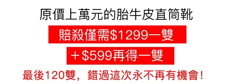 5分鐘前【30年老鞋廠結業】原價上萬元的胎牛皮直筒靴【賠殺僅NT$1299一雙,+599再得一雙!】最後120雙!減齡小圓頭,日常百搭,細腿利器! - 【破殺價】+599 NT$1898免運到手2雙